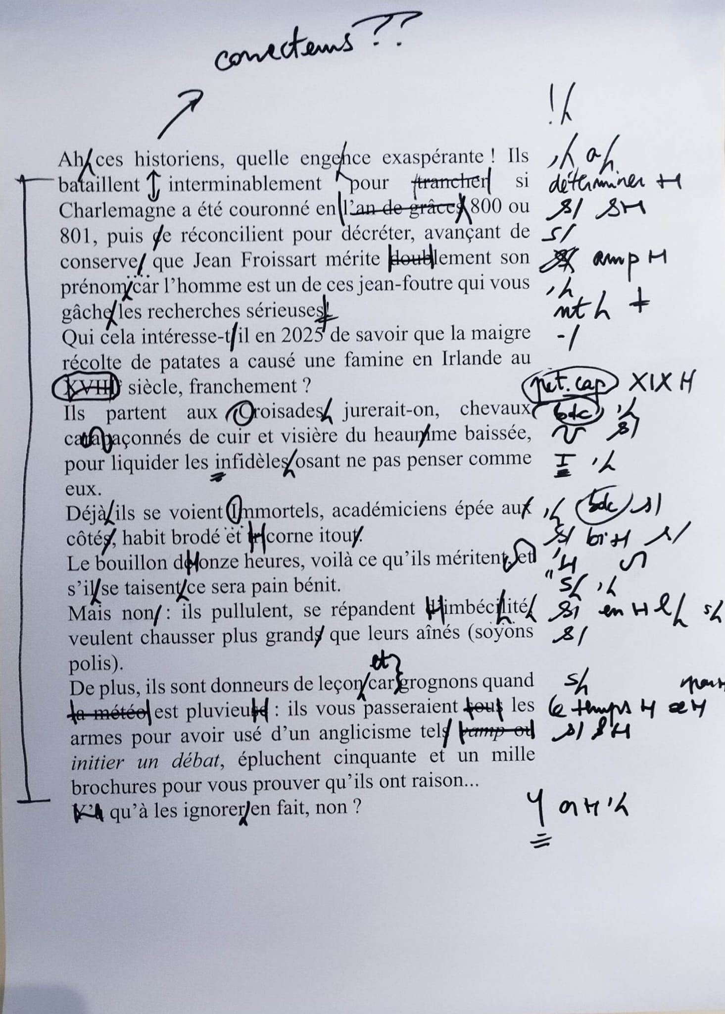 Voici en photo le résultat de la délibération entre 48 correcteurs — autant dire qu’il y avait quelques divergences… Outre l’exercice proposé à nos confrères, c’est aussi une magnifique photo en guise d’introduction aux signes de correction, qui permettra aux non-professionnels de se rendre compte de ce que peut être un travail de préparation en profondeur !